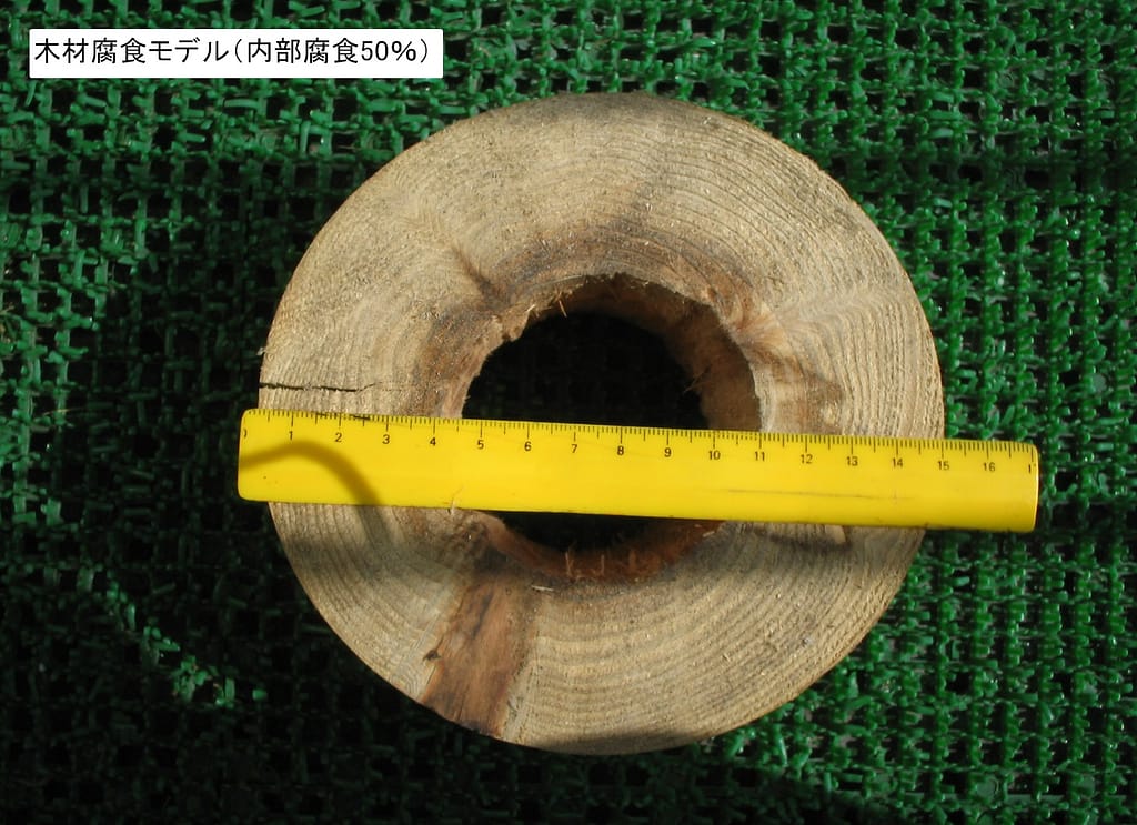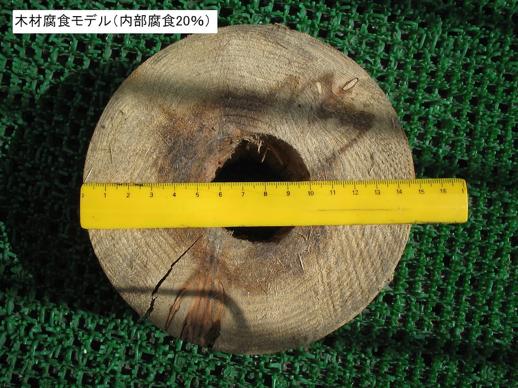 この支柱内部が写真のように約20%腐食したと仮定した場合、素材の強度は初期値の約80%に減少します。
