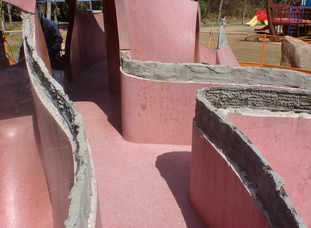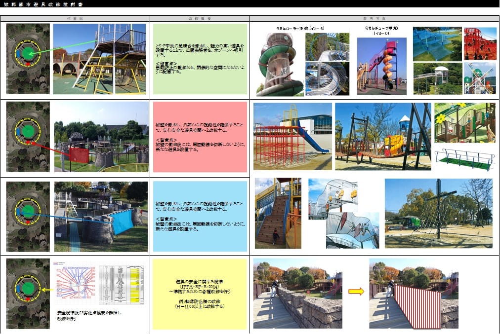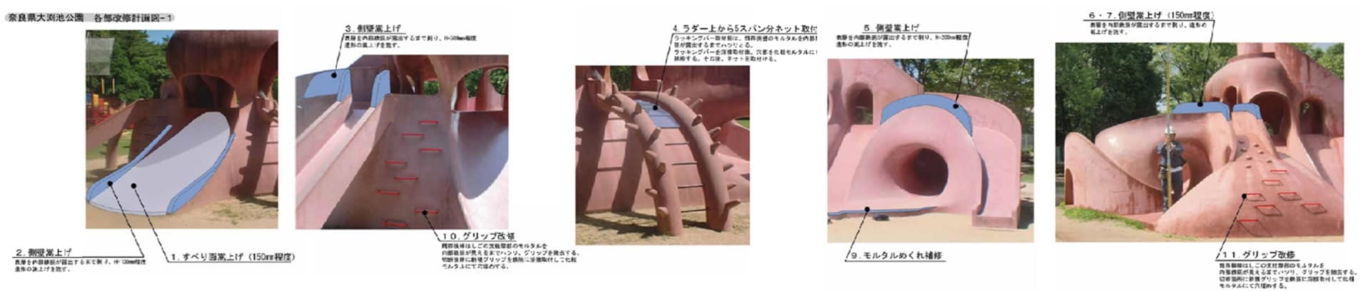 既存遊具の問題点と課題を抽出し、より楽しく安全に遊べる遊具となるように計画します。この遊具の場合、城壁に囲まれた内部が死角となり、悪戯の発生件数が増加していました。