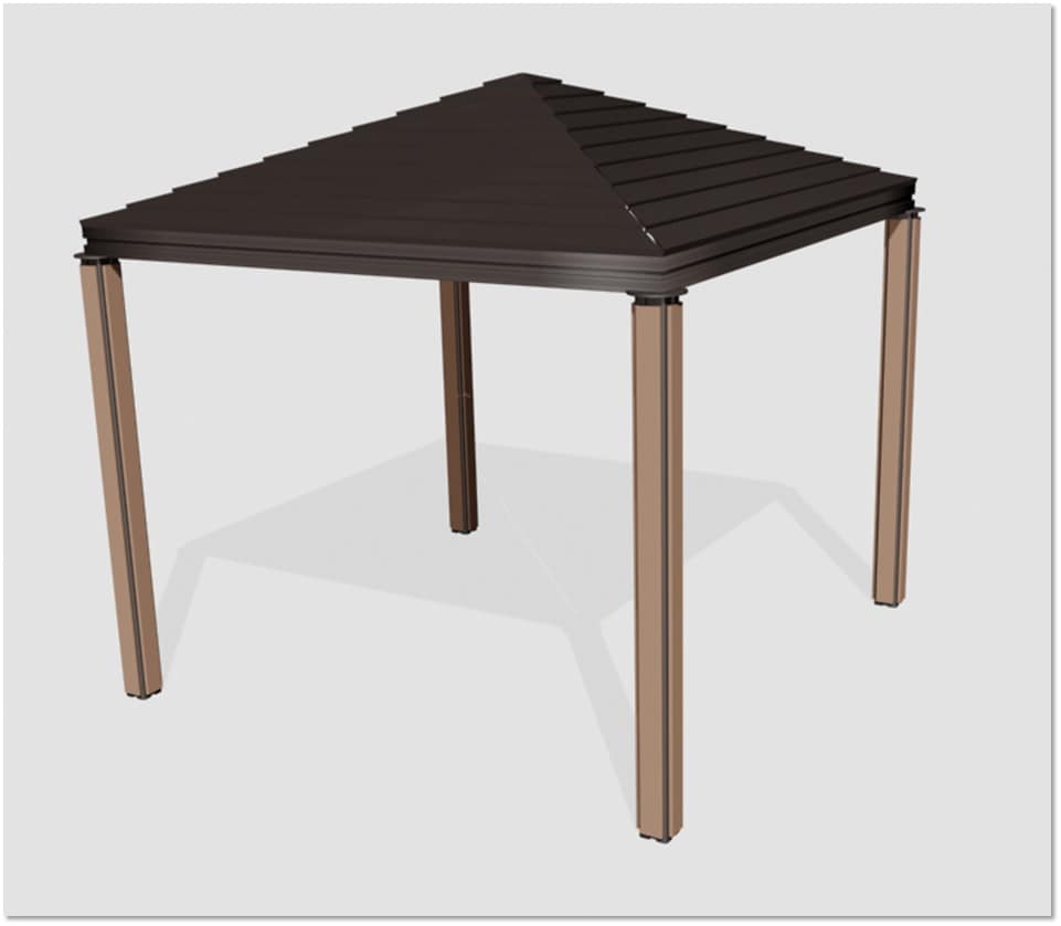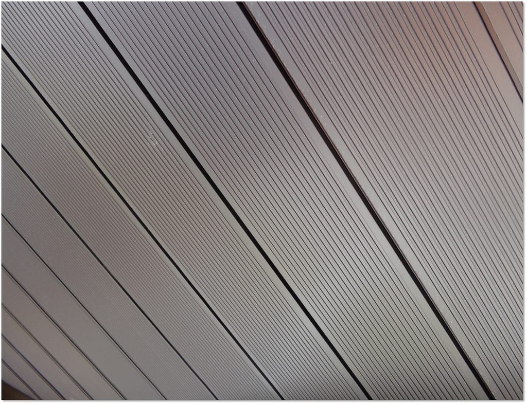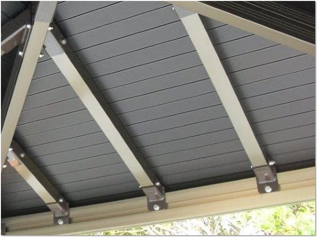 従来のアルミシェルターの野路板(屋根の裏側です)部は、屋根葺材とは別にベニア板等の板材を貼り付ける、もしくは、素地のままむき出しの構造でした。OTアルミシェルターは、屋根葺部と野路板部がアルミ一体構造であるため、写真のように大変美しい仕上がりとなり、高級感があります。