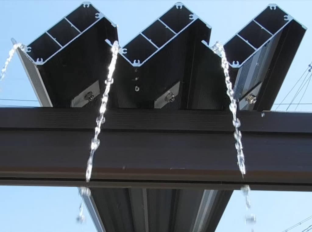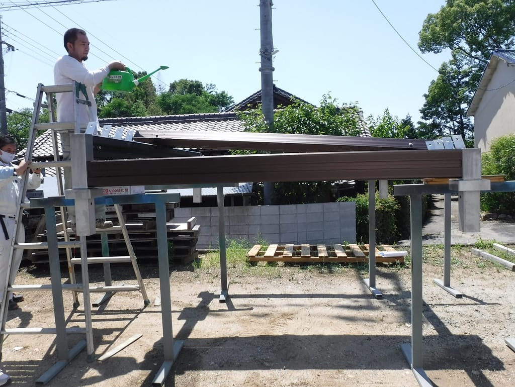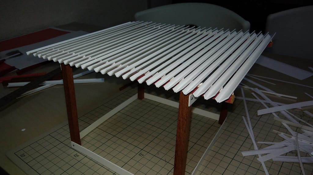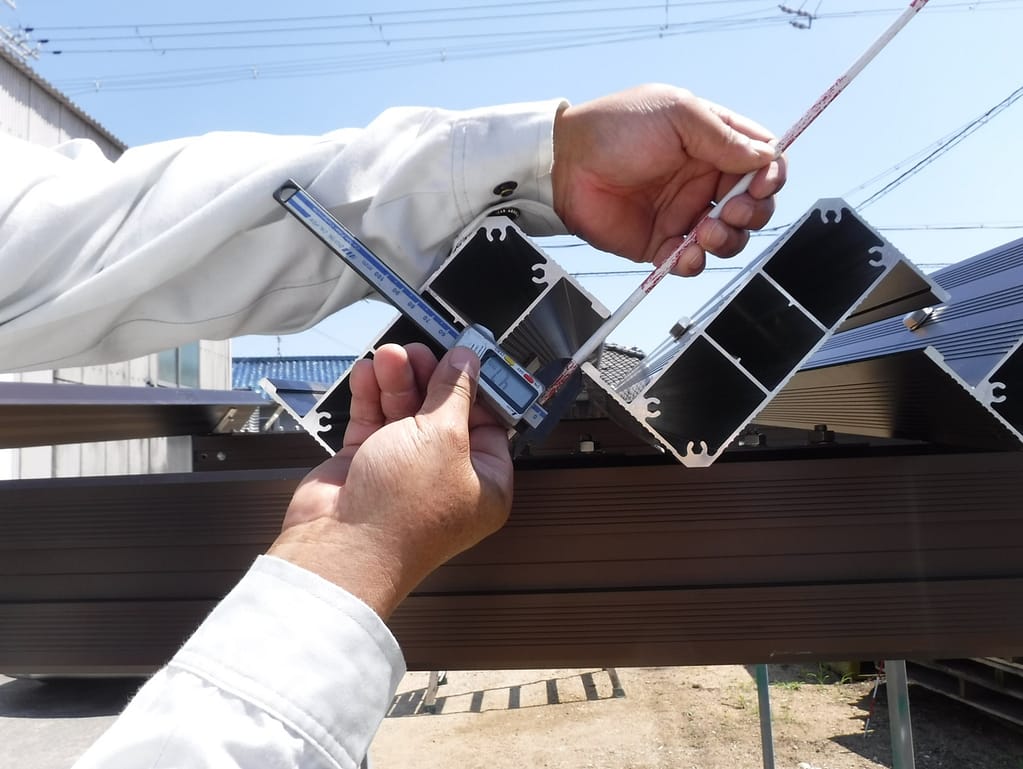 机上のデータに加えて、実際に試してみることが必要です。まずは、模型を製作した後、実物大の試作品を製作して、実際に設置した場合にどのように日陰を形成し、雨水はどんな速さで流れるのか、バチャバチャとこぼれることはないのか等を検証します。